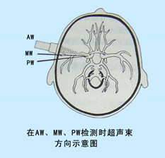 超聲束經(jīng)顳骨鱗部進(jìn)入顱內(nèi)的通道。在顴弓上方眼眶外緣與耳翼之間分前窗(AW) 、中窗(MW) 、后窗(PW)三個(gè)窗位。中窗是常用的窗口,而老年人常用后窗。可檢測(cè)到:大腦前動(dòng)脈、大腦中動(dòng)脈、大腦后動(dòng)脈、前交通動(dòng)脈、后交通動(dòng)脈、頸內(nèi)動(dòng)脈終末段及基底動(dòng)脈分叉處。用2MHz 脈沖多普勒探頭,檢測(cè)深度: 50~70mm 左右,體位: 受檢者仰臥位,頭置正位。
