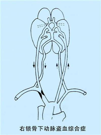 當鎖骨下動脈或無名動脈的起始部發生部分或完全阻塞時,由于上肢用力或運動時,會發生血流的轉移或再分配,即患側椎動脈的血流減少或產生反向流動,而進入患側鎖骨下動脈的遠離阻塞部,從而產生了椎-基底動脈供血不足和患側上肢的缺血,稱之為鎖骨下動脈盜血綜合征。